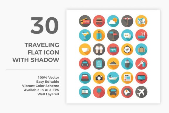 30 Traveling Flat Icons With Shadow