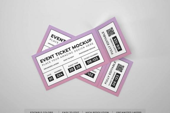 Graphic templates of Realistic Event Ticket Mockup Template in Photoshop format. Editable colors, organized layers & easy to use smart objects. Use this on your next design project with ease.