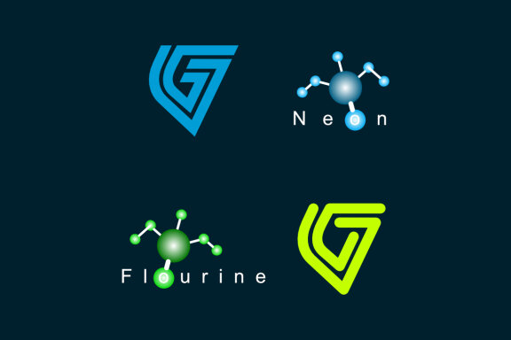 The vector consists of fluorescent Fluorine atoms and the VG VC monogram.