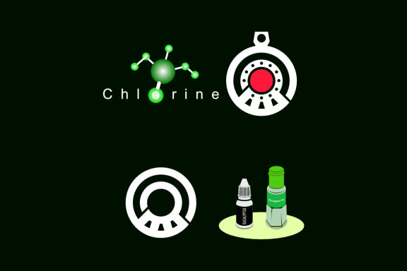 Vector set of locomotives and monogrammed chlorine atom bottles.