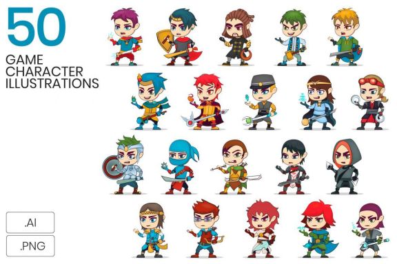 In this collection you'll find 50 vector illustrations of various game characters such as warrior, thief, mage, magician, archer, fighter, ninja, samurai, gunner, knight, swordsman and more.