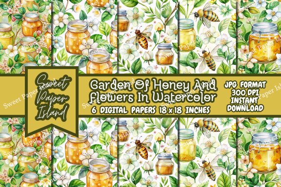 🍯🐝Pack Of 6 Digital Papers - Garden Of Honey And Flowers In Watercolor