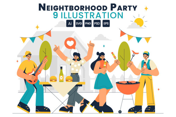 Neighborhood Events Vector Illustration featuring Friends and Family Celebrating Holidays with an Outdoor Party, Local Food Festival, and a BBQ Table Suitable for Poster, Web Banner, Brochure, Landing Page and Others Background Template Features: